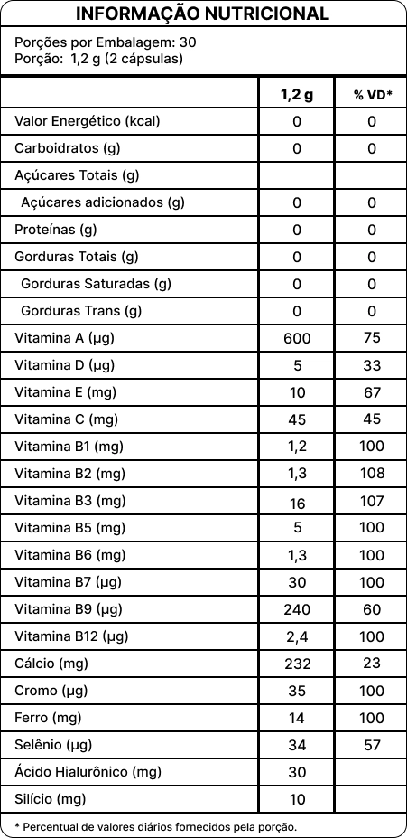 Força, Crescimento e Vitalidade. Formulado para nutrir de dentro para fora, nosso suplemento auxilia no fortalecimento dos fios, estimula o crescimento saudável e melhora a resistência capilar. Sua ação contribui para uma barba mais cheia, uniforme e bem definida, além de proporcionar cabelos mais fortes, brilhantes e com aparência saudável.